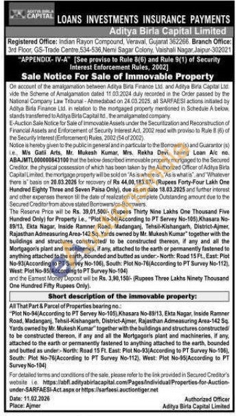 All That Part & Parcel of Properties bearing no. "Plot No-34(According to PT Servey No-105), Khasara No-89/13, Ekta Nagar, Inside Ramner Road, Madanganj, Tehsil-Kishangarh, District-Ajmer, Rajasthan Admeasuring Area-142 Sq. Yards owned by Mr. Mukesh Kumar together with the buildings and structures constructed to be constructed thereon, if any and all the Mortgagor's plant and machineries, if any, attached to the earth or permanently fastened to anything attached to the earth, bounded and butted as under North: Road 15 Ft. East: Plot No-93 According to PT Survey No-106), South: Plot No-76(According to PT Survey No-112). West: Plot No-95(According to PT Survey No-104)