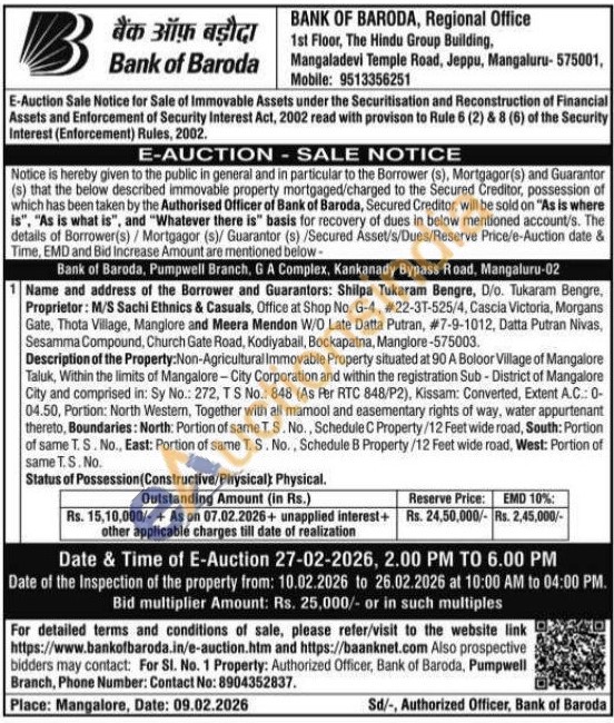 Description of the Property:Non-Agricultural Immovable Property situated at 90 A Boloor Village of Mangalore Taluk, Within the limits of Mangalore-City Corporation and within the registration Sub-District of Mangalore City and comprised in: Sy No.: 272, TS No.: 848 (As Per RTC 848/P2), Kissam: Converted, Extent A.C: 0-04.50, Portion: North Western, Together with all mamool and easementary rights of way, water appurtenant thereto, Boundaries: North: Portion of same T. S. No., Schedule C Property/12 Feet wide road, South: Portion of same T. S. No., East: Portion of same T. S. No., Schedule B Property/12 Feet wide road, West: Portion of same T. S. No