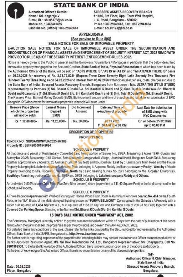 All that piece and parcel of Residentially Converted Land being portion of Survey No. 29/2A, Measuring 2 Acres 19.64 Guntas and Survey No. 29/28, Measuring 10.64 Guntas, Both Situated in Jaraganahalli Village, Uttarahalli Hobli, Bangalore South Taluk, Measuring together approximately 2 Acres 30.28 Guntas (1,20,094 Sq. feet) and bounded on: East by: Kanakapura Main Road and the House Property belonging to Lakshminarayana Reddy and Plots belonging to Appanna Reddy and Narayanaswamy Reddy: West by: Private Property belonging to Mis. Gopalan Enterprises, North by: Land bearing Survey No. 29/1 belonging to Mis. Gopalan Enterprises, South by: Remaining portion of Survey No. 29/2A and 29/28 belonging to Lakshminarayana Reddy and Others. SCHEDULE B PROPERTY An undivided 0.509% share (Zero Point Five Zero Nine percent) share (equivalent to 611.40 Square Feet) in the land comprised in the Schedule A Property. SCHEDULE C PROPERTY A Three Bedroom Apartment with Vitrilled Flooring with Honne Wood Flush Doors & Aluminium Windows bearing No. 404 on the Fourth Floor, in the "BA" Block, of the Multi-storeyed Building known as "PURVA BELMONT" Constructed in the Schedule A Property with a super built up area of 1,464 Sq. Feet (ie, built up area of 1183.07 Sq. Feet and Common area of 280.93 Sq Feet) together with a Covered Car Parking Space, Standing in the Name of Sri. Bharat K Doshi S/o. Sri. Kantilal G Doshi.