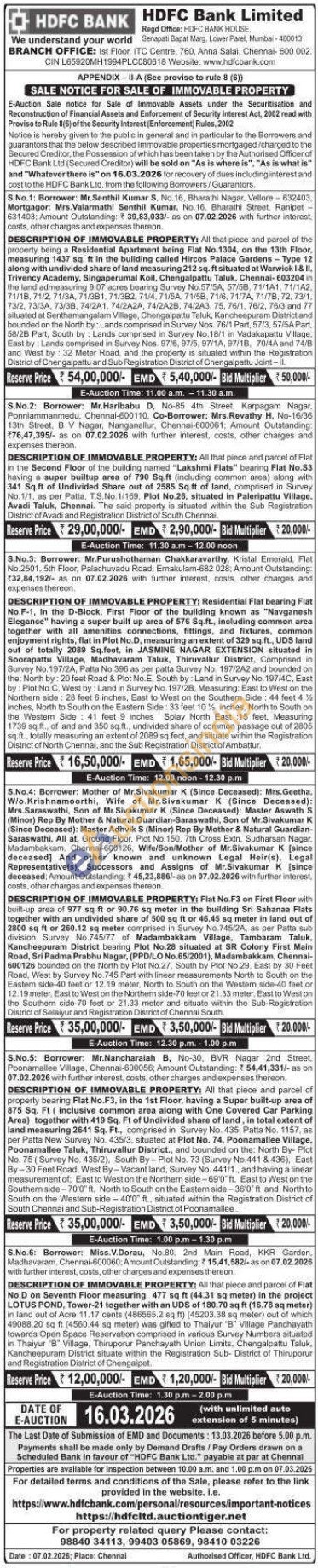 DESCRIPTION OF IMMOVABLE PROPERTY: All that piece and parcel of Flat in the Second Floor of the building named "Lakshmi Flats" bearing Flat No.83 having a super builtup area of 790 Sq.ft (including common area) along with 341 Sq.ft of Undivided Share out of 2585 Sq.ft of land, comprised in Survey No.1/1, as per Patta, T.S.No. 1/169, Plot No.26, situated in Paleripattu Village, Avadi Taluk, Chennai. The said property is situated within the Sub Registration District of Avadi and Registration District of South Chennai