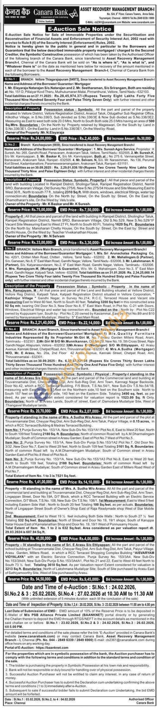 4) Property-II standing in the name of Mrs. A Sudha Wio Arasu: All the part and parcel of the plot at Tiruvannamalai Dist, Cheyyar Reg Dist, Arni Sub-Reg Dist, Arni Taluk, Paiyur Village, in 0.15 acres, in which a RCC Terraced Building & Madras Terraced Building. Item No: 1 Punja Survey No. 153/1A, New Sub-Div No. 153/1A1 Plot No.6, East to West 20 feet North to South 109 feet Totaling 2180 Sq. ft. Boundaries: North of common Road left by A.M. Dharmalingam Mudaliyar, South of Common street in Arasu Garden; East of Plot No.7 West of Plot No.5. Item No: 2: Punja Survey No. 153/1A, New Sub-Div Punja S.No. 153/1A2 Plot No.7. Old Door No. 3/32, New Door No.7, East to West 29 feet, North to South 109 feet Totaling 3161 Sq. ft. Boundaries: North of common Road left by A.M.Dharmalingam Mudaliyar, South of Common street in Arasu Garden East of Plot No.8 West of Plot No.6. Item No: 3: Punja Survey No. 153/1A, New Sub-Div No. 153/1A3 Plot No.8, East to West 20 feet, North to South 109 feet, Totaling 2180 Sq.feet. Boundaries: North of common Road left by A.M. Dharmalingam Mudaliyar, South of Common street in Arasu Garden East of Millers Road West of Plot No.7