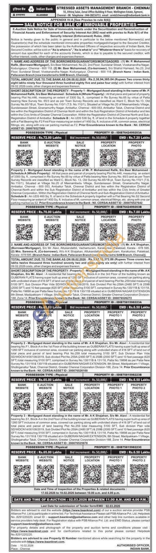 2) Property 1-Mortgaged Asset standing in the name of Mr. AK Shajahan, S/o Mr. Alavi: A residential flat bearing No.T1, Block-A in the 3rd Floor of the building known as GUBERAN FLATS having super built up area of 1260 SFT inclusive of common area, covered car parking along with undivided share of 416 SFT of land out of total piece and parcel of land bearing Plot No.259 total measuring 5100 SFT, Sub Division Plan Vide SD/WDCN14/00108/2019, Sub Divided Plot No.259A (2480 SFT) & 259B (2000 SFT) and 10 feet passage (620 SFT) total measuring 5100 SFT, comprised in Survey No. 130/118 & 131/18, Patta No. 19898 as per Patta New Survey No. 131/18 & 130/11B situated at in GUBERAN NAGAR EXTENSION 8th Street, Madipakkam-1 Village, Sholinganallur Taluk, Chennai District, Greater Chennai Corporation Division-188, Zone 14. Prior Encumbrance known to the Bank: Nil. CERSAIASSETID: 200076526272