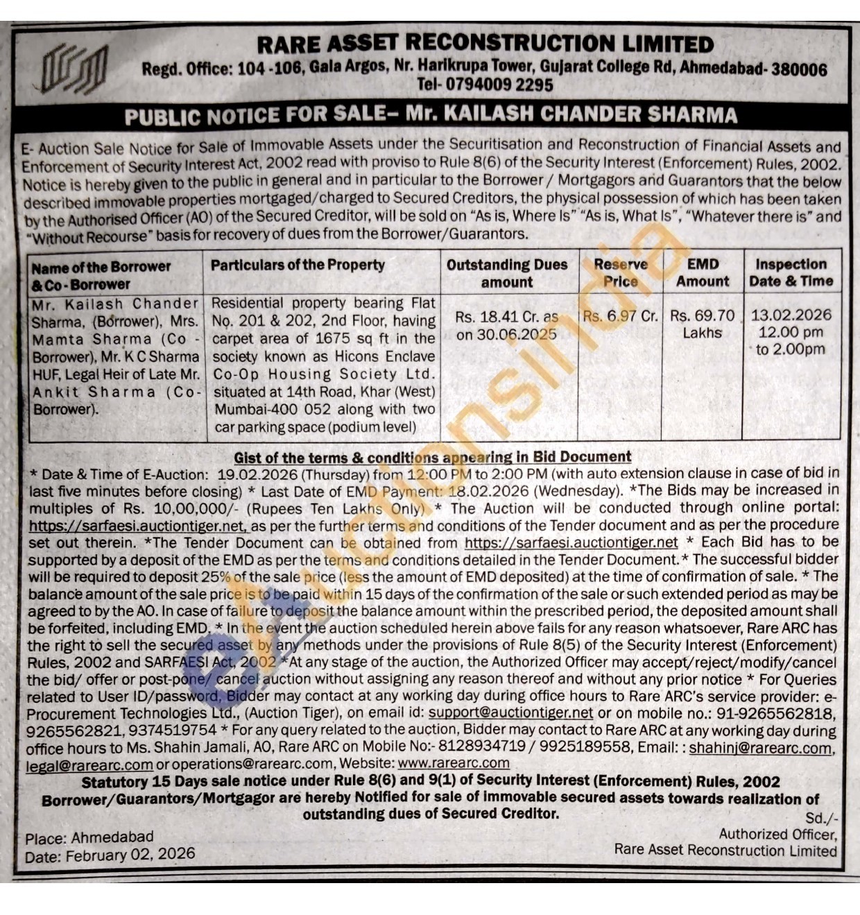 Residential property bearing Flat No. 201 & 202, 2nd Floor, having carpet area of 1675 sq ft in the society known as Hicons Enclave Co-Op Housing Society Ltd. situated at 14th Road, Khar (West) Mumbai-400 052 along with two car parking space (podium level)