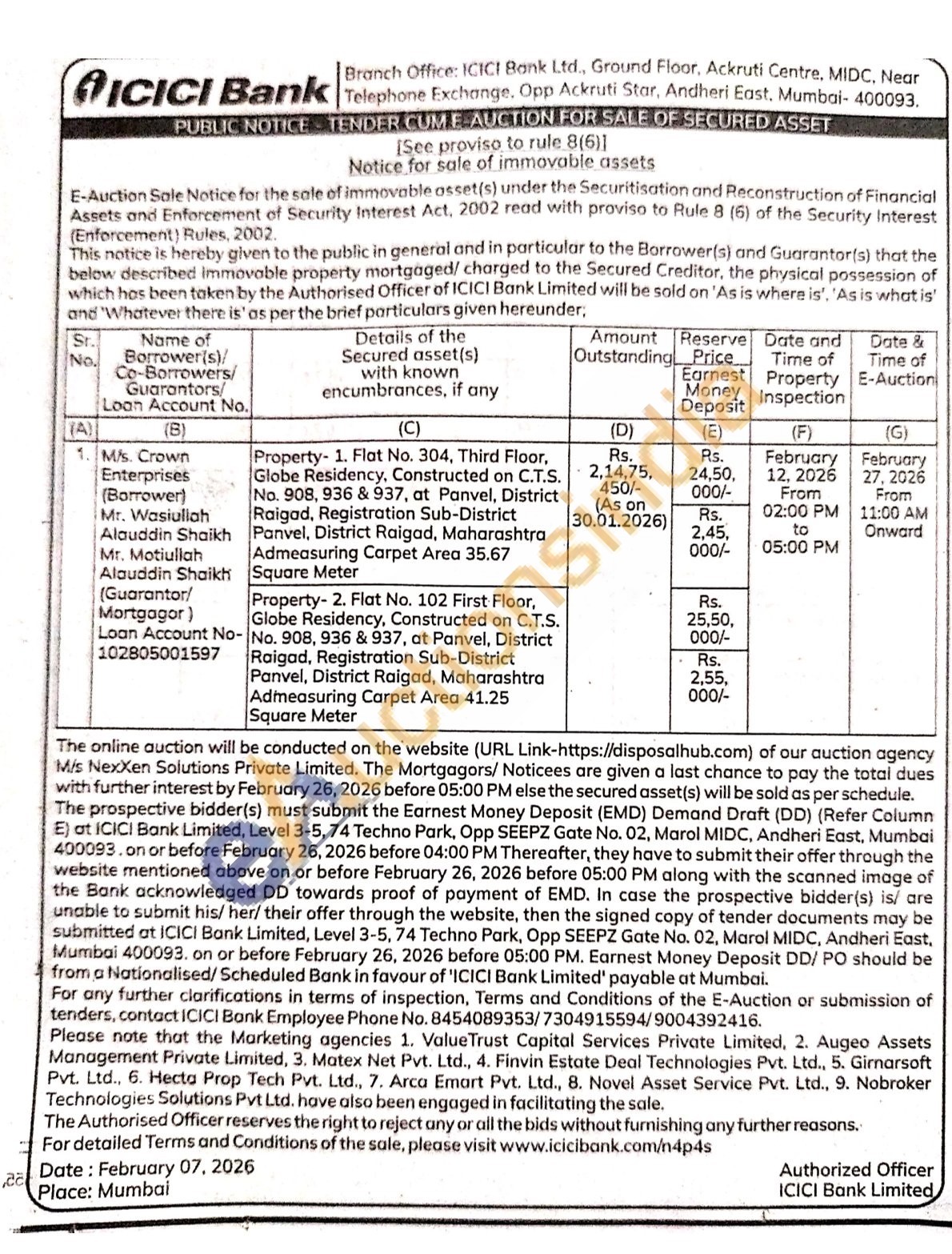 Property- 2. Flat No. 102 First Floor, Globe Residency, Constructed on C.T.S. No. 908, 936 & 937, at Panvel, District Raigad, Registration Sub-District Panvel, District Raigad, Maharashtra Admeasuring Carpet Area 41.25 Square Meter