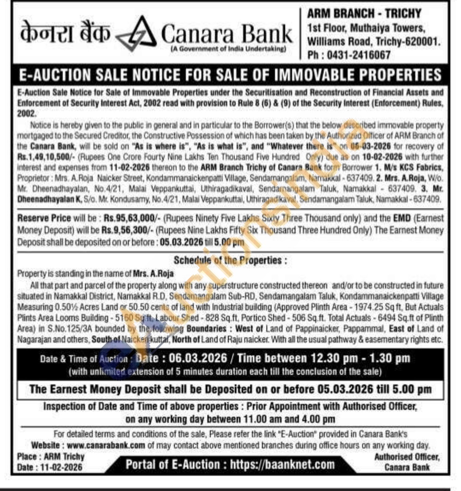 All that part and parcel of the property along with any superstructure constructed thereon and/or to be constructed in future situated in Namakkal District, Namakkal R.D, Sendamangalam Sub-RD, Sendamangalam Taluk, Kondammanaickenpatti Village Measuring 0.50% Acres Land or 50.50 cents of land with Industrial building (Approved Plinth Area-1974.25 Sq ft, But Actuals Plints Area Looms Building-5160 Sq.ft, Labour Shed-828 Sq.ft, Portico Shed-506 Sq.ft. Total Actuals - 6494 Sq.ft of Plinth Area) in S.No.125/3A bounded by the following Boundaries: West of Land of Pappinaicker, Pappammal, East of Land of Nagarajan and others, South of Naicken kuttai, North of Land of Raju naicker. With all the usual pathway & easementary rights etc.