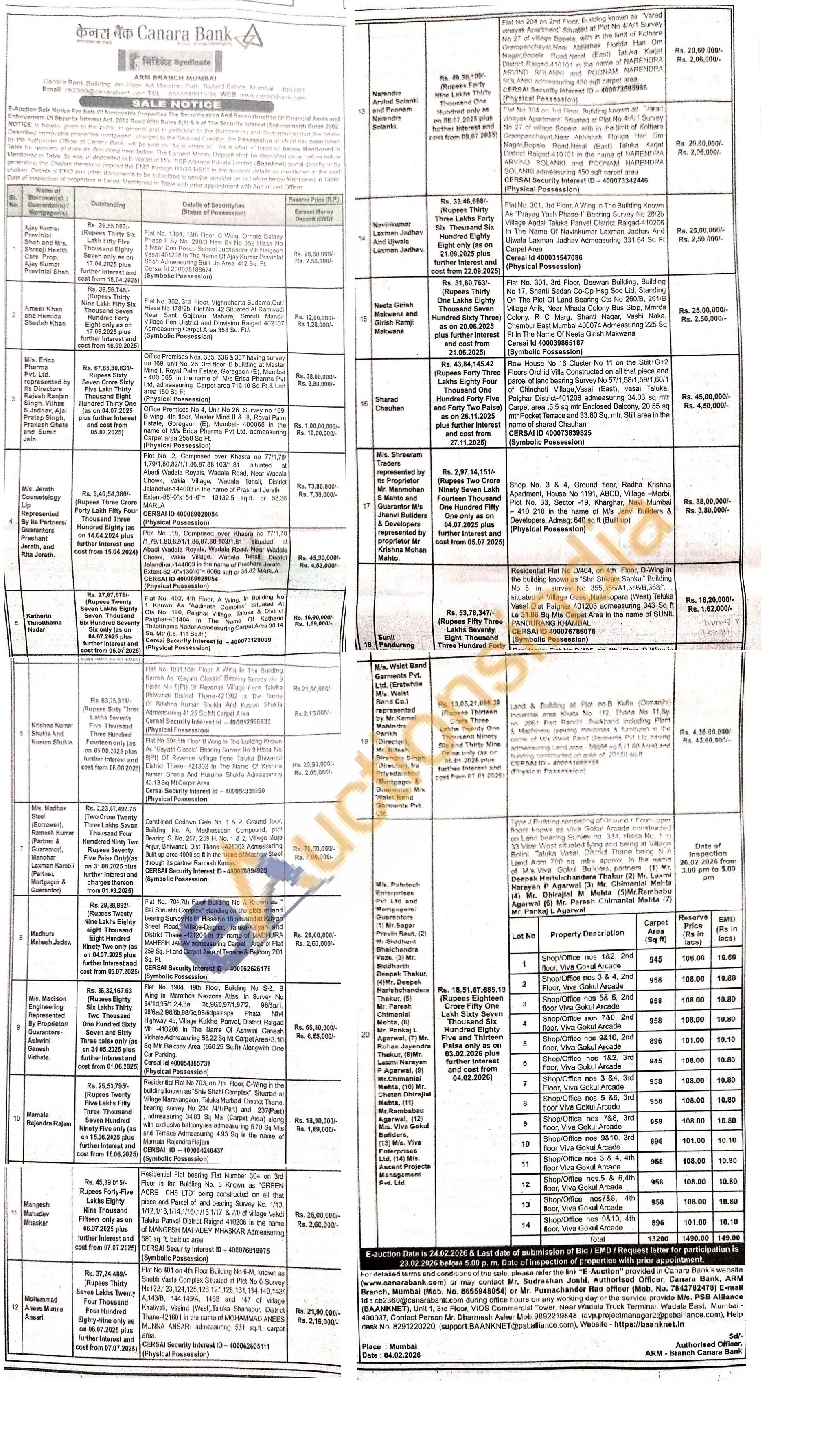 Mr. Sudrashan Joshi, Authorised Officer, Canara Bank, ARM Branch, Mumbai (Mob. No. 8655948054) or Mr. Purnachander Rao officer (Mob. No. 7842782478)