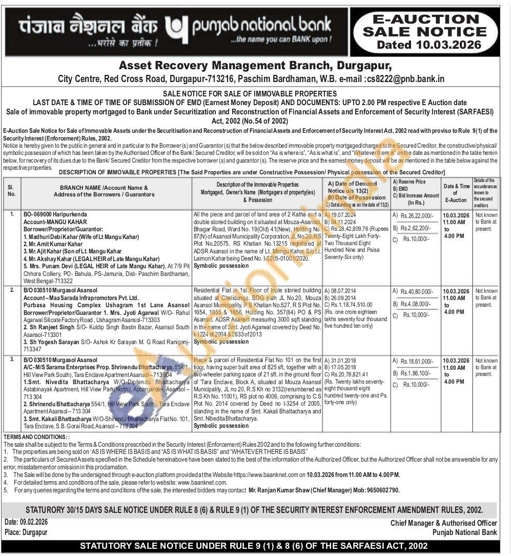 Piece & parcel of Residential Flat No 101 on the first floor, having super built area of 825 sft, together with a two-wheeler parking space of 21 sft. in the ground floor of Tara Enclave, Block A, situated at Mouza Asansol Municipality, JL no 20, R.S Kh no 3132 (renumbered as R.S Kh No. 11001), RS plot no 4006, comprising to C.S Plot No. 2014 covered by Deed no 1-3254 of 2005, standing in the name of Smt. Kakali Bhattacharya and