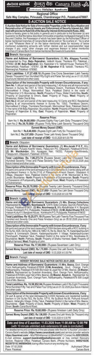 Description of the immovable Property with known Encumbrances, if any. Item No. 1: All part and parcel of the land measuring 1.40 Acres and all improvements thereon in Survey No. 135/1 & 135/2, Thenkkara Desom, Thenkkara Panchayath Mannarkkad Village, Mannarkkad Taluk Palakkad District in the name of Mr. Rajendran VD Boundaries-North: Property of Thayu, Water Chal & Way, South: Property of Gopinathan & Others, East: Property of Thayu, West: Property of Bhaskaran, Water Chal & Way