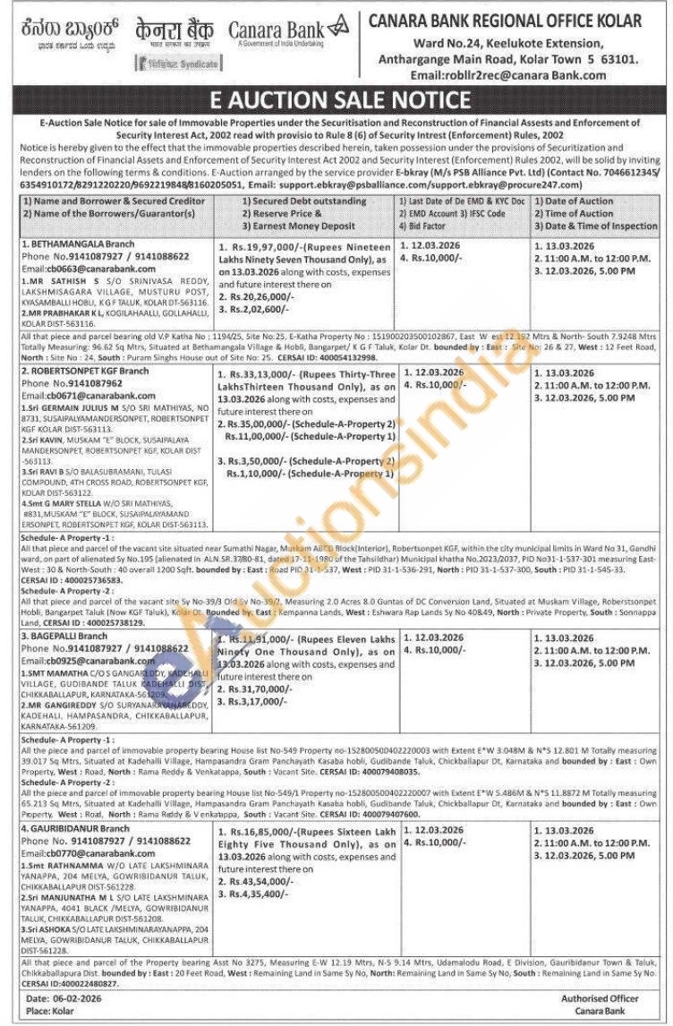 All that piece and parcel of the vacant site situated near Sumathi Nagar, Muskam ABCD Block Interior), Robertsonpet KGF, within the city municipal limits in Ward No 31, Gandhi ward, on part of alienated Sy No.195 (alienated in ALN.SR 3780-61, dated 17-11-1980 of the Tahsildhar) Municipal khatha No.2023/2037, PID No31-1-537-301 measuring East West: 30 & North-South: 40 overall 1200 Sqft. bounded by: East: Road PID 31-1-537, West: PID 31-1-336-291, North: PID 31-1-537-300, South: PID 31-1-545-33. CERSAI ID: 400025736583