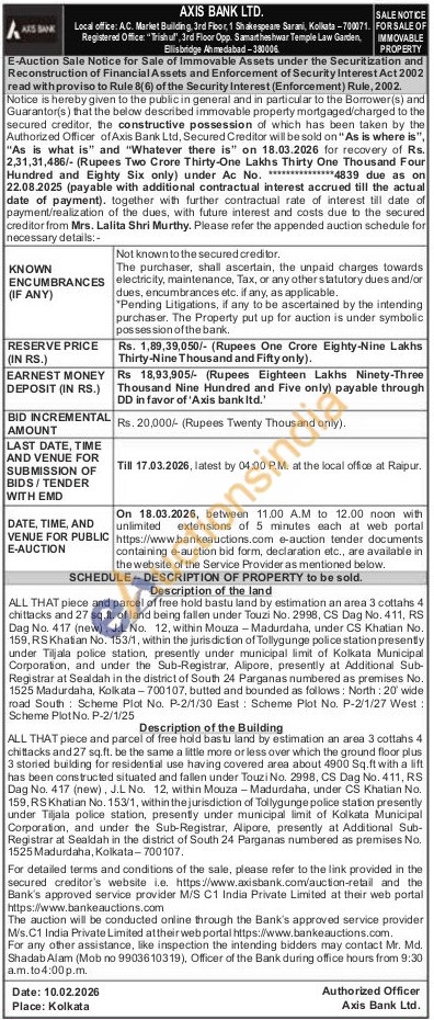 Description of the land : ALL THAT piece and parcel of free hold bastu land by estimation an area 3 cottahs 4 chittacks and 27 sq.ft. of land being fallen under Touzi No. 2998, CS Dag No. 411, RS Dag No. 417 (new), J.L No. 12, within Mouza Madurdaha, under CS Khatian No. 159, RS Khatian No. 153/1, within the jurisdiction of Tollygunge police station presently under Tiljala police station, presently under municipal limit of Kolkata Municipal Corporation, and under the Sub-Registrar, Alipore, presently at Additional Sub-Registrar at Sealdah in the district of South 24 Parganas numbered as premises No. 1525 Madurdaha, Kolkata-700107, butted and bounded as follows: North: 20 wide road South Scheme Plot No. P-2/1/30 East: Scheme Plot No. P-2/1/27 West: Scheme Plot No. P-2/1/25