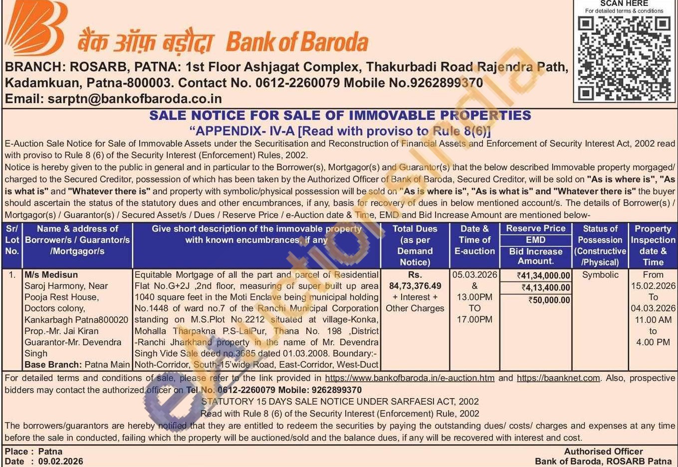 Equitable Mortgage of all the part and parcel of Residential Flat No.G+2J 2nd floor, measuring of super built up area 1040 square feet in the Moti Enclave being municipal holding No.1448 of ward no.7 of the Ranchi Municipal Corporation standing on M.S.Plot No.2212 situated at village-Konka, Mohalla Tharpakna P.S-LalPur, Thana No. 198, District -Ranchi Jharkhand property in the name of Mr. Devendra Singh Vide Sale deed no.3685 dated 01.03.2008. Boundary : Noth-Corridor, South-15'wide Road, East-Corridor, West-Duct