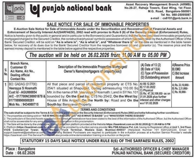 All that piece and parcel of residential property at CTS No. 254/1 situated at Shapurpet, Gadag admeasuring 110.00 Sq Mtr. in the name of Mr. Veerayya S Hosmath: Land in SY No. 101 bounded by: On the East by: CTS No 254/2, On the West by: House of Bile Angadi, On the North by: Road and On the South by: Bereyavar Property