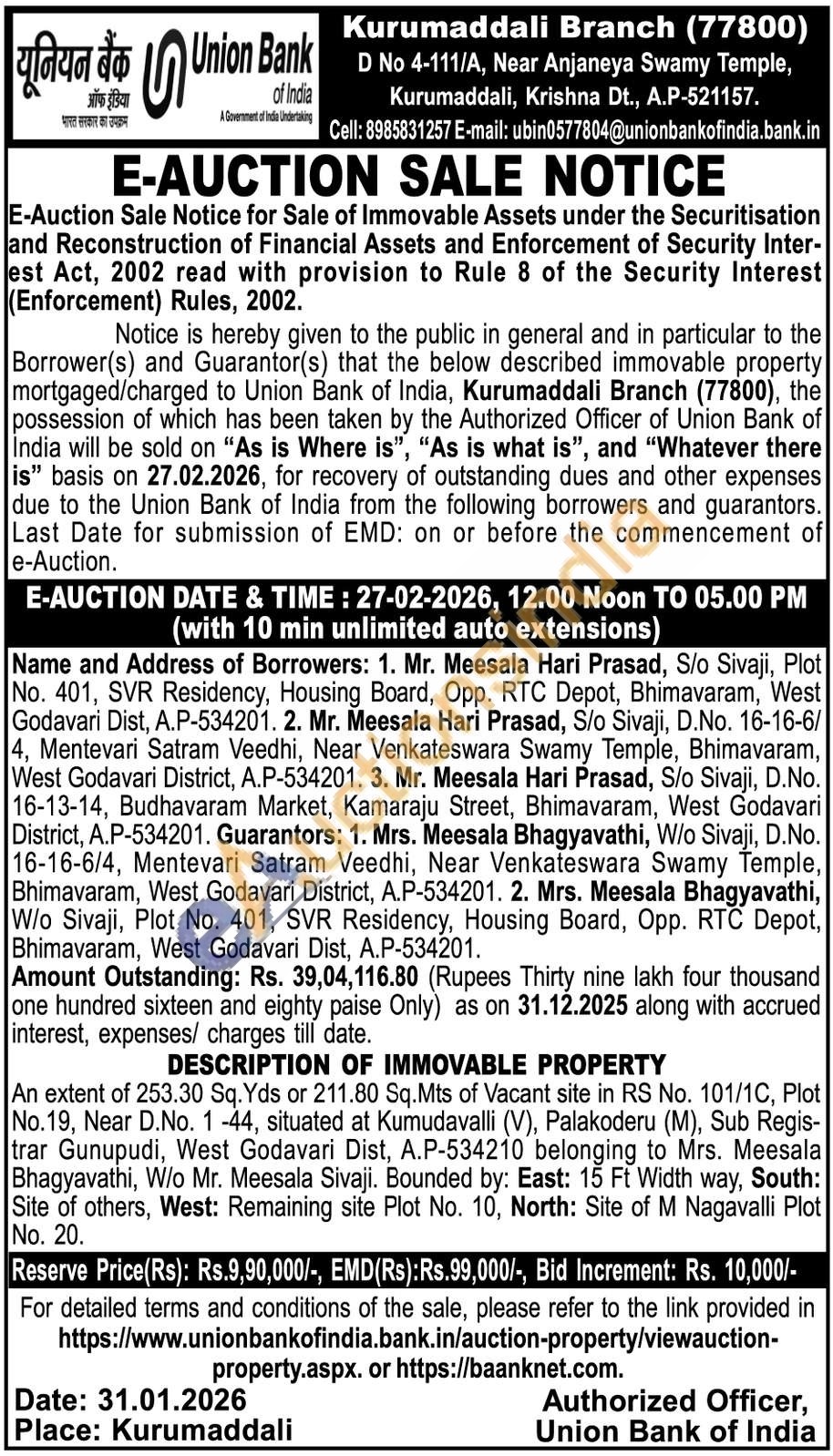 An extent of 253.30 Sq. Yds or 211.80 Sq.Mts of Vacant site in RS No. 101/1C, Plot No.19, Near D.No. 1-44, situated at Kumudavalli (V), Palakoderu (M), Sub Regis-trar Gunupudi, West Godavari Dist, A.P-534210 belonging to Mrs. Meesala Bhagyavathi, W/o Mr. Meesala Sivaji. Bounded by: East: 15 Ft Width way, South: Site of others, West: Remaining site Plot No. 10, North: Site of M Nagavalli Plot No. 20.