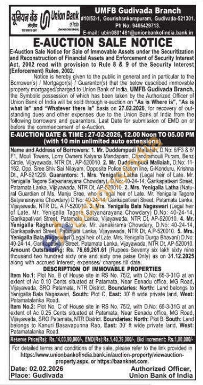 Item No.1: Plot No. B of House site in RS No. 75/2, with D.No: 65-3-31G at an extent of Ac 0.10 Cents situated at Patamata, Near Eenadu office, MG Road, Vijayawada, SRO Patamata, NTR District, Boundaries: North: Land belongs to Yenigalla Bala Nageswari, South: Plot C. East: 30' ft wide private land, West: Patamatalanka Road. Item No.2: Plot No. C of House site in RS No. 75/2, with D.No: 65-3-31G at an extent of Ac 0.25 Cents situated at Patamata, Near Eenadu office, MG Road, Vijayawada, SRO Patamata, NTR District. Boundaries: North: Plot B, South: Land belongs to Kanuri Basavapunna Rao, East: 30 ft wide private land, West: Patamatalanka Road.