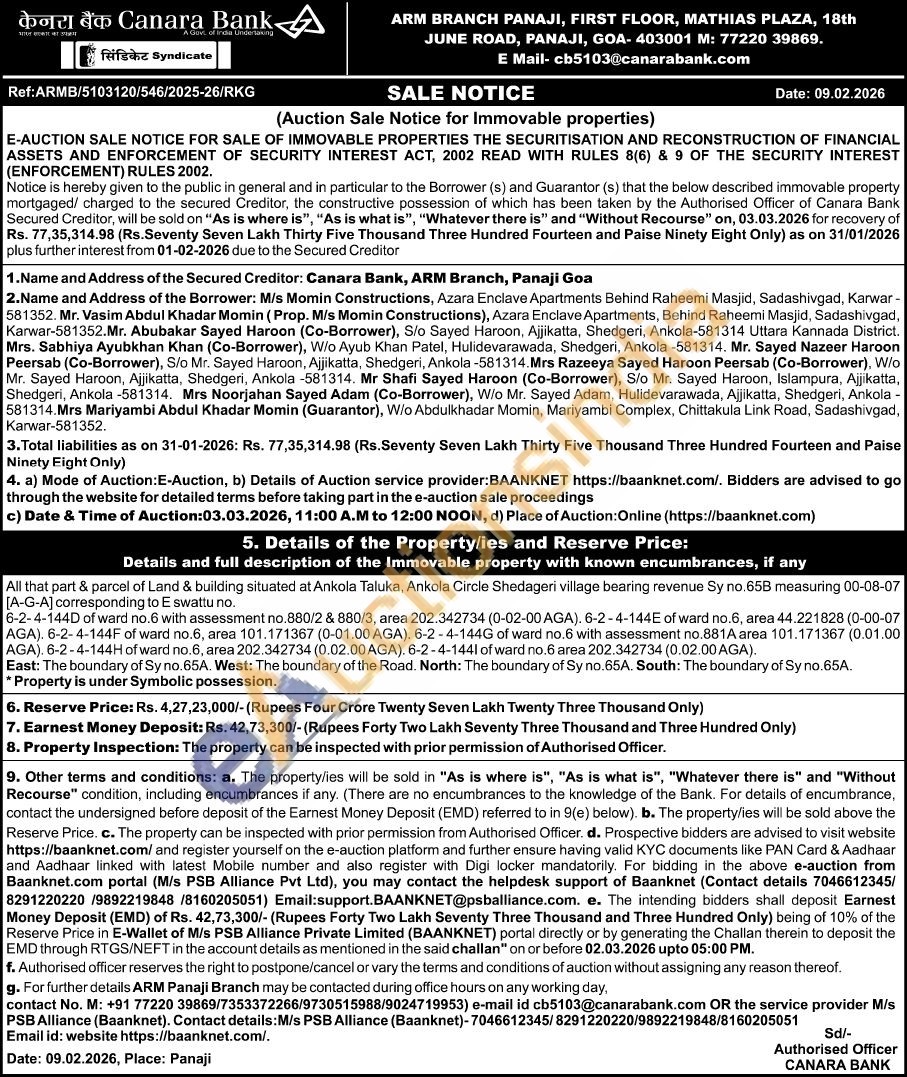 All that part & parcel of Land & building situated at Ankola Taluka, Ankola Circle Shedageri village bearing revenue Sy no.65B measuring 00-08-07 [A-G-A] corresponding to E swattu no. 6-2-4-144D of ward no.6 with assessment no.880/2 & 880/3, area 202.342734 (0-02-00 AGA). 6-2-4-144E of ward no.6, area 44.221828 (0-00-07 AGA), 6-2-4-144F of ward no.6, area 101.171367 (0-01.00 AGA). 6-2-4-144G of ward no.6 with assessment no.881A area 101.171367 (0.01.00 AGA). 6-2-4-144H of ward no.6, area 202.342734 (0.02.00AGA), 6-2-4-1441 of ward no.6 area 202.342734 (0.02.00 AGA). East: The boundary of Sy no.65A. West: The boundary of the Road. North: The boundary of Sy no.65A. South: The boundary of Sy no.65A