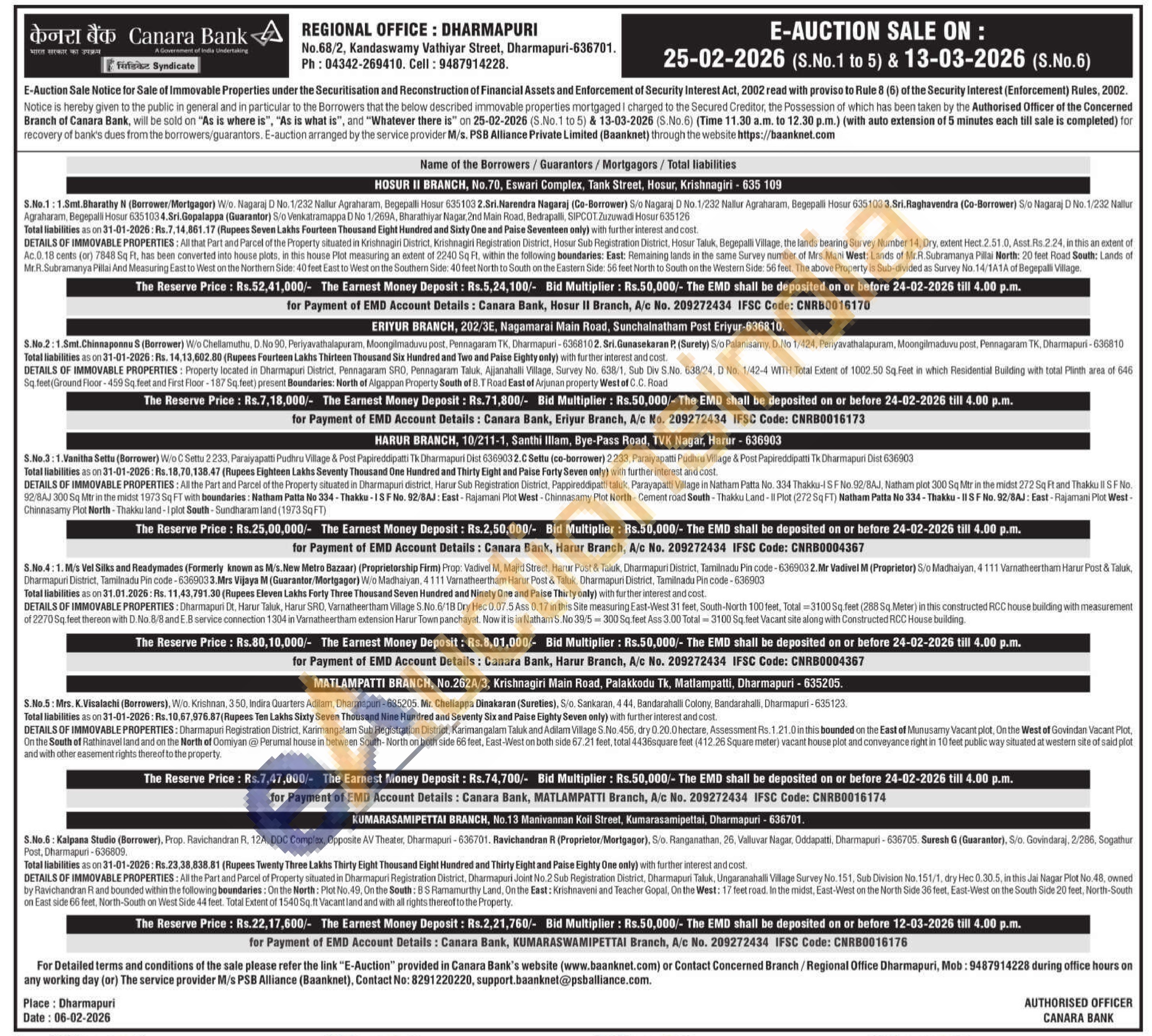 DETAILS OF IMMOVABLE PROPERTIES: Dharmapuri Dt. Harur Tiluk, Harur SRO, Varnatheer than Viltage S. No.6/18 Dry Hec 0.107.5 Ass 0.17 in this Site measuring East-West 31 feet, South-North 100 feet, Total 3100 Sq. feet (288 Sq.Meter) in this constructed RCC house building with measurement of 2270 Sq feet thereon with D. No BandE B service connection 1304 in Varnatheertham extension Harur Town panchayat. Now it is in Natham S.No 39/5-300 Sq. feet Ass 3.00 Total-3100 Sq feet Vacant site along with Constructed RCC House building.