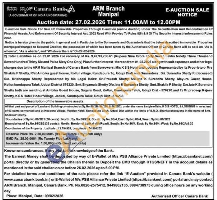 All that part and parcel of Land and Building constructed at Sy.No.86/28 (86/281 & 86/282), under the name & style of Mis. KSS HOTEL & LODGING in an extent of 63 cents converted land at Hosooru Village, Vandse Hobli, Kundapura Taluk, Udupi Dist within the limits of S.R.O. Shankaranarayana in the name of Smt. Shakila P Shetty.