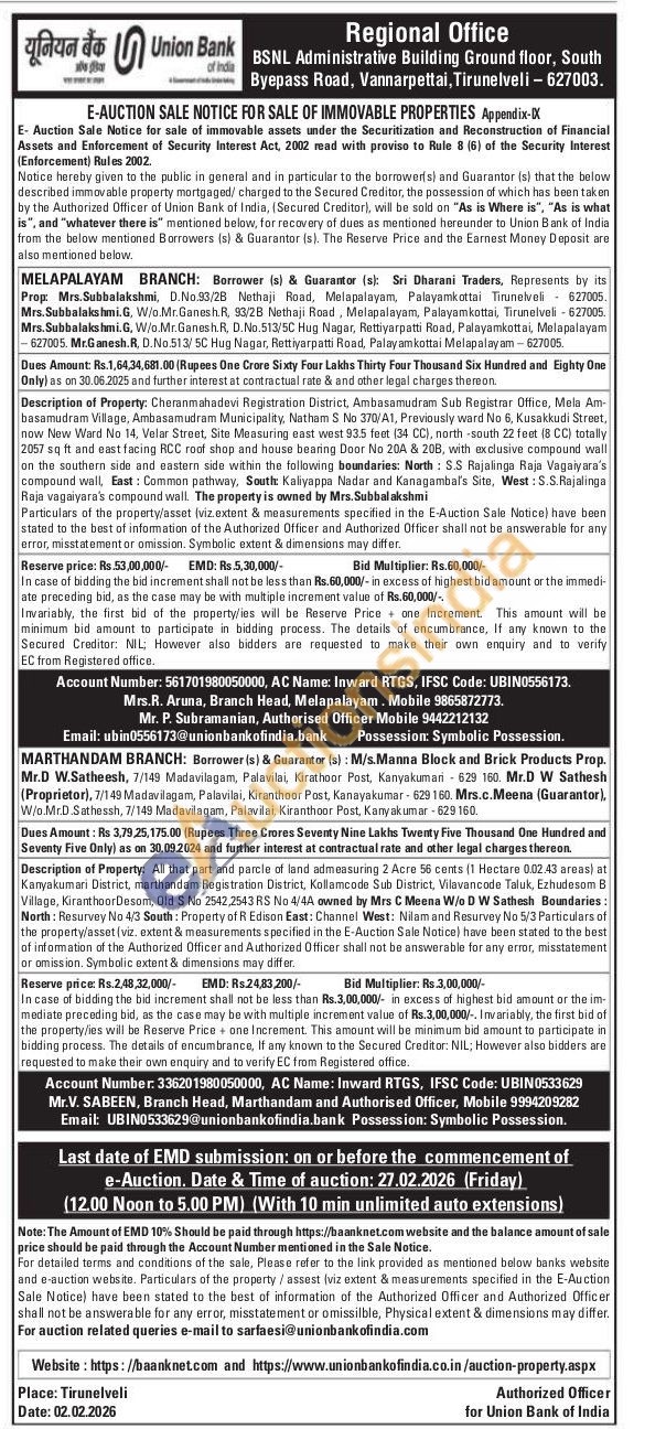 Description of Property: Cheranmahadevi Registration District, Ambasamudram Sub Registrar Office, Mela Am-basamudram Village, Ambasamudram Municipality, Natham S No 370/A1, Previously ward No 6, Kusakkudi Street, now New Ward No 14, Velar Street, Site Measuring east west 93.5 feet (34 CC), north-south 22 feet (8 CC) totally 2057 sq ft and east facing RCC roof shop and house bearing Door No 20A & 20B, with exclusive compound wall on the southern side and eastern side within the following boundaries: North: S.S Rajalinga Raja Vagaiyara's compound wall, East: Common pathway, South: Kaliyappa Nadar and Kanagambal's Site, West: S.S.Rajalinga Raja vagaiyara's compound wall. The property is owned by Mrs. Subbalakshmi Particulars of the property/asset (viz.extent & measurements specified in the E-Auction Sale Notice) have been stated to the best of information of the Authorized Officer and Authorized Officer shall not be answerable for any error, misstatement or omission. Symbolic extent & dimensions may differ