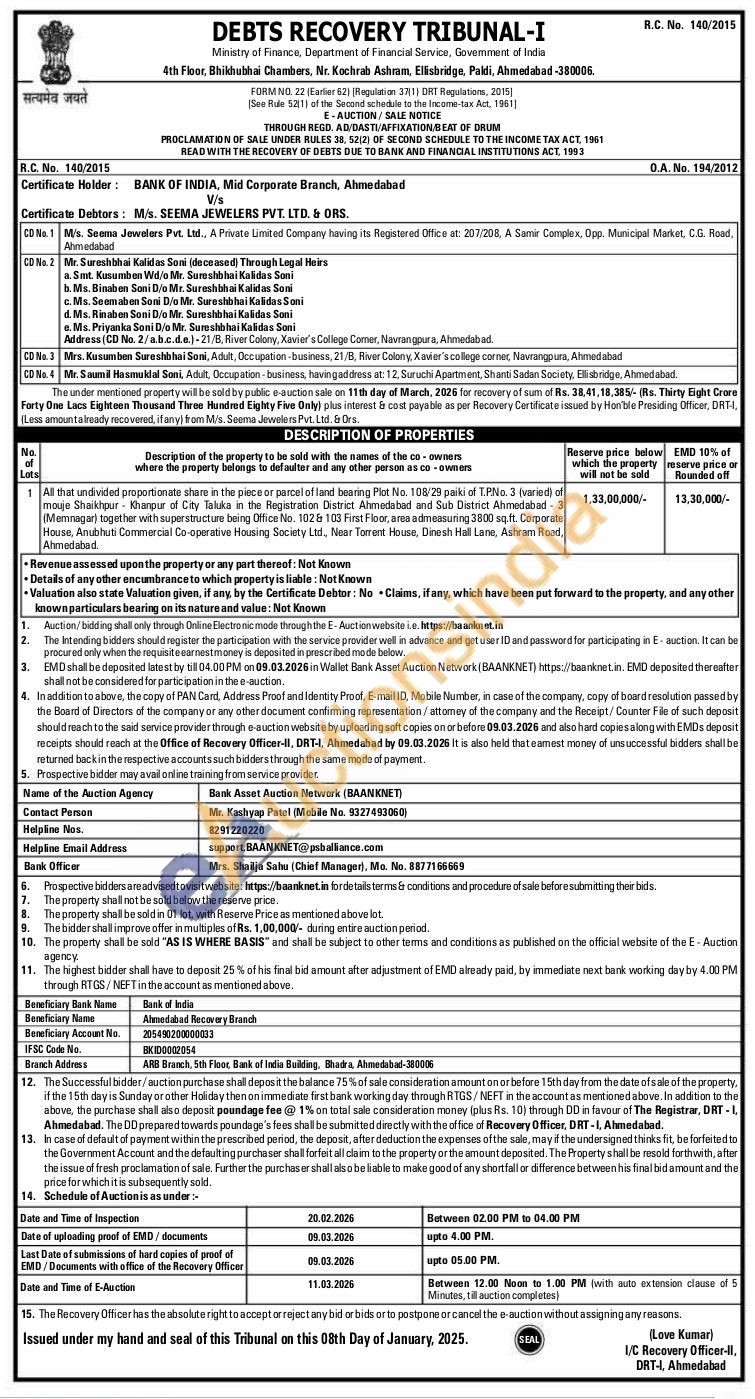 All that undivided proportionate share in the piece or parcel of land bearing Plot No. 108/29 paiki of T.P.No. 3 (varied) of mouje Shaikhpur Khanpur of City Taluka in the Registration District Ahmedabad and Sub District Ahmedabad 3 (Memnagar) together with superstructure being Office No. 102 & 103 First Floor, area admeasuring 3800 sq.ft. Corporate House, Anubhuti Commercial Co-operative Housing Society Ltd., Near Torrent House, Dinesh Hall Lane, Ashram Road, Ahmedabad.
