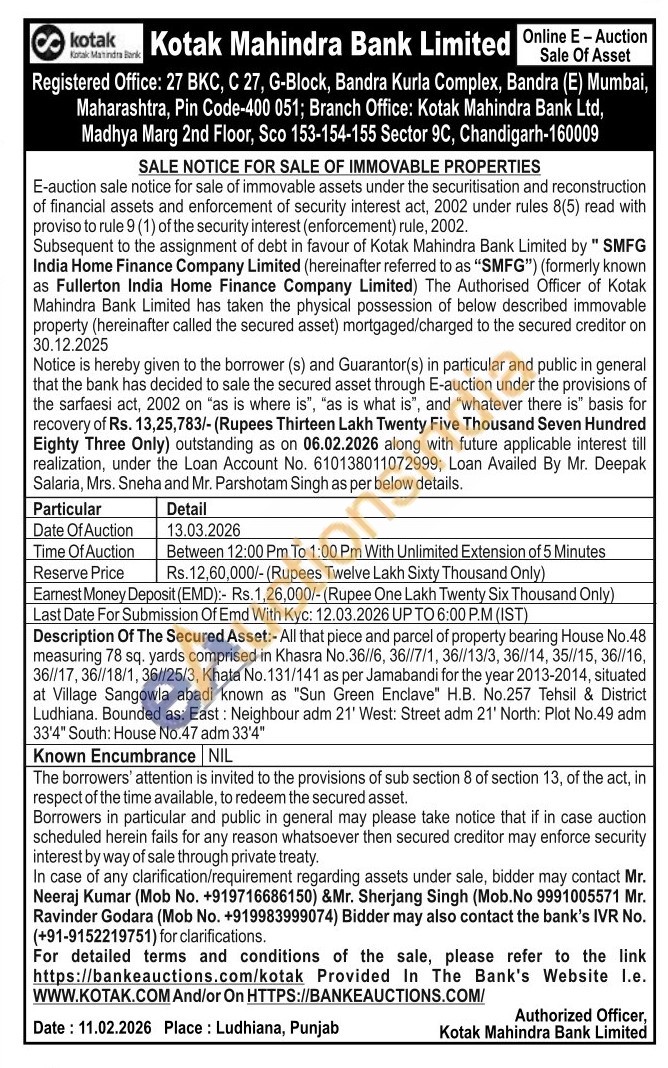 Description Of The Secured Asset:- All that piece and parcel of property bearing House No.48 measuring 78 sq. yards comprised in Khasra No.36//6, 36//7/1, 36//13/3, 36//14, 35//15, 36//16, 36//17, 36//18/1, 36//25/3, Khata No. 131/141 as per Jamabandi for the year 2013-2014, situated at Village Sangowla abadi known as "Sun Green Enclave" H.B. No.257 Tehsil & District Ludhiana. Bounded as: East: Neighbour adm 21' West: Street adm 21' North: Plot No.49 adm 33'4" South: House No.47 adm 33'4"