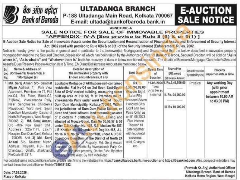 Equitable Mortgage of All that one self-contained residential Flat No-C4 on 3rd floor, East-South Side of G+IV storied building, measuring super . built up area of 310 Sq. ft. at Premises no 71, . Vivekananda Pally under ward No-2 of South Dum Dum Municipality, Kolkata-700065, Within the jurisdiction of Dum Dum Police Station, on of piece and parcel of bastu land measuring an area of 2 cottahs 7 chittacks 29 sq.ft. Laying and , situated at Mouza-Gouri, Dag No 55,56,57 & 58 , under C.S Khatian No. 456, R.S. khatian No 457, L.R Khatian No-180 under L.R Dag No-185, J.L. No 16, R.S. No 24, Touzi No 118B, under A.D.S.R. Cossipore Dum Dum in the District of North 24 , Parganas. Owner of Property: Md. Seraj Ansari, , Bounded: On the North: By Vivekananda Pally. On , the South: By other property, On the East By other property, On the West: By 10 ft wide Road