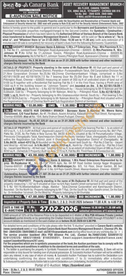 DETAILS OF PROPERTY: All that piece and parcel of residential flat with site bearing Plot No.1, to an extent of 4312 sq.ft., L.S.S.VIJAY AVENUE (Approved Layout D.T.C.P.No. 9/2007) Comprised in survey No. 84/1 Part, Patta No. 3135, As Per Patta in New Survey No. 84/20 & 84/21, situated at No. 14 Perumattunallur Village, Previously Chengalpattu Taluk, Kancheepuram District, Presently Vandalur Taluk, chengalpattu District, lying within the Registration Sub District Joint II Chengalpattu and Registration District of Chengalpattu. In S.No.84/20, extent-4312 Sq.ft Bounded on the North by Vacant land South by -Plot No.2 East by-Vacant land West by-40 feet road In S.No.84/21, extent-3920 sq.ft., North by Plot No. 1 South by-Plot No.3 East by-Vacant land West by 40 feet road Totalling 8232 sq.ft, to an extent of Undivided Share of 386 sq.ft out of 8232 sq.ft., (Schedule Il Property) Built Up Area 1170 sq.ft. Flat No. B3, Third Floor, E.B.Connection etc