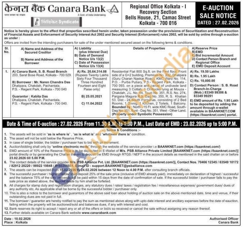 Residential Flat 600 Sq.ft. on the First floor, Front side of a G-2 building. Premises No. 232, Dhalipara (Guru Charan Naskar Road), KMC Ward No. 114, PO Purba Putiary, P.S.- Regent Park, Kolkata 700 093, on a piece and parcel of undivede land measuring 3. Cottah, 1 Chittacks lying at Mouza-Chakdah, J.L. No. 44. Touzi No. 351. R.S. No. 274, Pargana Magura R.S. Dag No. 350, R. S. Khatian 53. Dist 24 South Parganas, consisting of 2 Bed Rooms, 1 Dinnig, 1 Kitchen, 2 Toilets, 1 Balcony, Bounded by: North-15 Ft. wide KMC Road, South Dag No. 351. East-Dag No. 351. West-Other Land. (Property under Symbolic Possession)