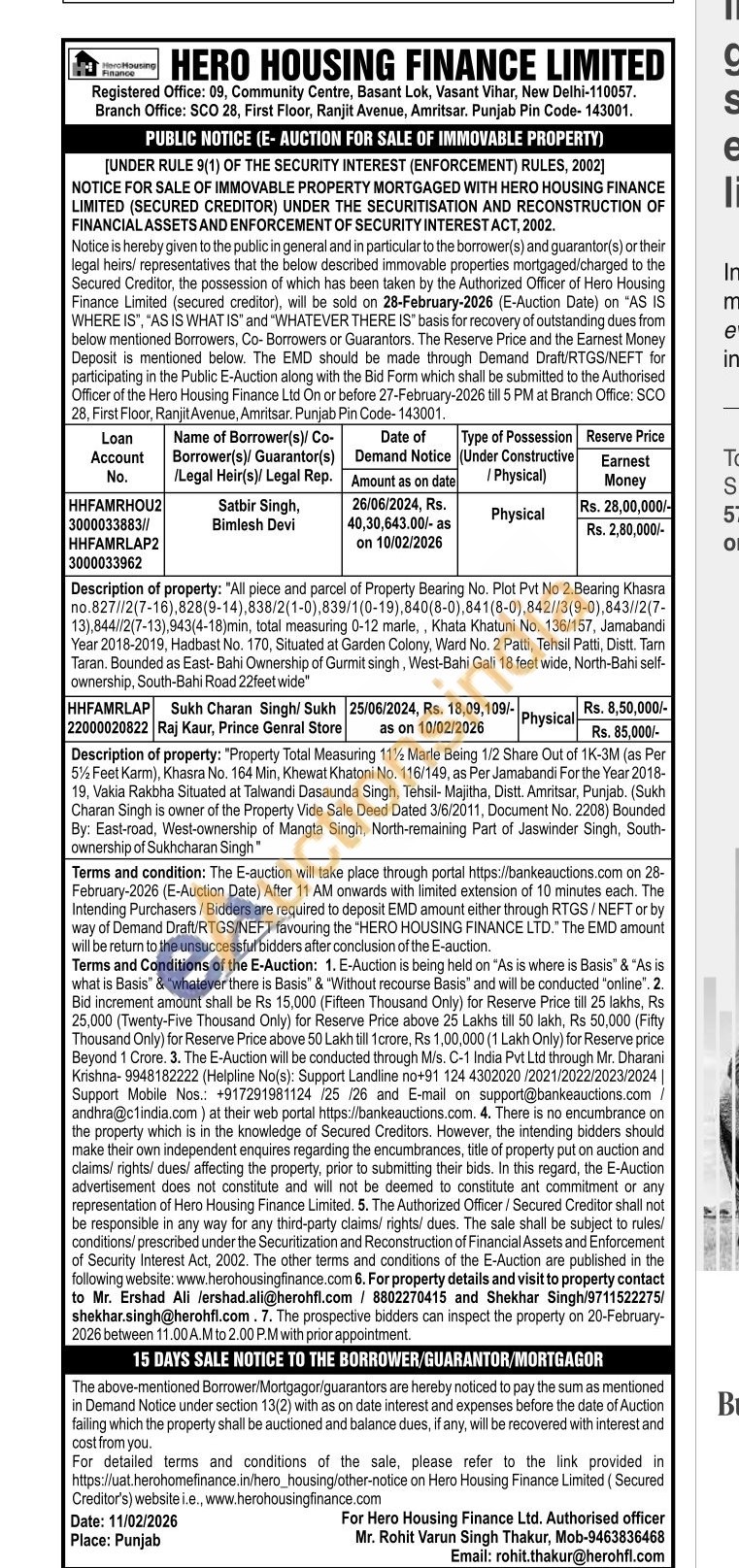 Description of property: "Property Total Measuring 11% Marie Being 1/2 Share Out of 1K-3M (as Per 5% Feet Karm), Khasra No. 164 Min, Khewat Khatoni No. 116/149, as Per Jamabandi For the Year 2018-19. Vakia Rakbha Situated at Talwandi Dasaunda Singh, Tehsil-Majitha, Distt. Amritsar, Punjab. (Sukh Charan Singh is owner of the Property Vide Sale Deed Dated 3/6/2011, Document No. 2208) Bounded By: East-road, West-ownership of Mangta Singh, North-remaining Part of Jaswinder Singh, South-ownership of Sukhcharan Singh"
