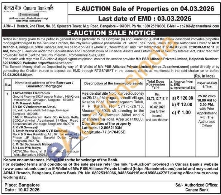 Residential Site No 5, carved out of sy no 29/13 of Mayagananahalli Village. Kasaba hobli, Ramanagaram Taluk, VP Katha No 571-5-29/13, Measuring 8000 sft standing in the name of Sri Ramesh Aithal and K Shantahrama Holla. Area Sq Ft 8000.