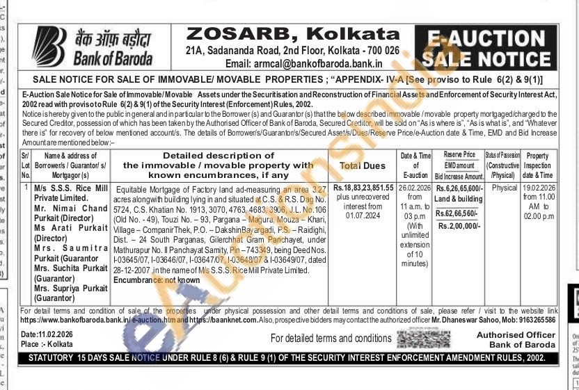 Equitable Mortgage of Factory land ad-measuring an area 3.27 acres alongwith building lying in and situated at C.S. & R.S. Dag No. 5724, C.S. Khatian No. 1913, 3070, 4763, 4683, 3906, J.L. No. 106 (Old No. 49), Touzi No.-93, Pargana - Magura, Mouza - Khari, Village-Companir Thek, P.O. - DakshinBayargadi, P.S. - Raidighi, Dist. 24 South Parganas, Gilerchhat Gram Panchayet, under Mathurapur No. II Panchayat Samity, Pin-743349, being Deed Nos. 1-03645/07, 1-03646/07, 1-03647/07, 1-03648/07 & 1-03649/07, dated 28-12-2007 in the name of M/s S.S.S. Rice Mill Private Limited. Encumbrance: not known