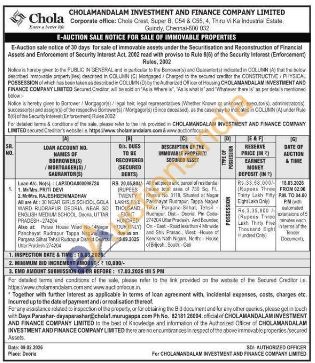All that piece and parcel of residential house total area of 730 Sq. Ft. Khasra No. 3118, Situated at Nagar Panchayat Rudrapur, Tappa Nagwa Tikar, Pargana-Silhat, Tehsil Rudrapur, Dist- Deoria, Pin Code-274204 Uttar Pradesh, And Bounded On-East:-Road less than 4 Mir wide and Shiv Prasad., West: House of Kendra Nath Nigam, North: - House of Brijesh South Gali