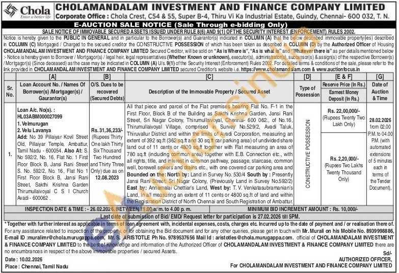 All that piece and parcel of the Flat premises bearing Flat No. F-1 in the First Floor, Block B of the Building as Sakthi Krishna Garden, Jansi Rani Street, Sri Nagar Colony, Thirumullaivoyal, Chennai- 600 062., of No. 16, Thirumul laivoyal Village, comprised in Survey No.529/2, Avadi Taluk, Thiruvallur District and within the limits of Avadi Corporation, measuring an extent of 392 sq.ft (362 sq.ft and 30 sq.ft carparking area) of undivided share land out of 11 cents or 4800 sq.ft together with Flat measuring an area of 780 sq.ft (including common area) together with E.B. Connection etc., with all rights, title, and interest in common pathway, passage, staircase, common well, borewell sewers and drains etc., with one covered car parking area and Bounded on the: North by: Land in Survey No. 530/4 South by: Presently Jansi Rani Street, Sri Nagar Colony, (Previously Land in Survey No.592/2) East by: Annamalai Chettiar's Land, West by: T. V. Venkatasubramanian's Land, In all measuring an extent of 11 cents or 4800 sq.ft of land and within the Registration District of North Chennai and South Registration of Ambattur