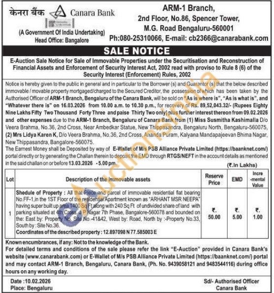 Shedule of Property: All that Piece and parcel of immovable residential flat bearing No.FF-1, in the 1ST Floor of the residential Apartment known as "ARHANT MSR NEEPA having super built up area 1400 Sq Ft along with 240 Sq Ft of undivided share of land with parking situated at 4th Cross, JP Nagar 7th Phase, Bangalore-560078 and bounded on the: East by: Property No. Site No.-41842, West by: Road, North by:-Property No.33, South by: Site No.36.
