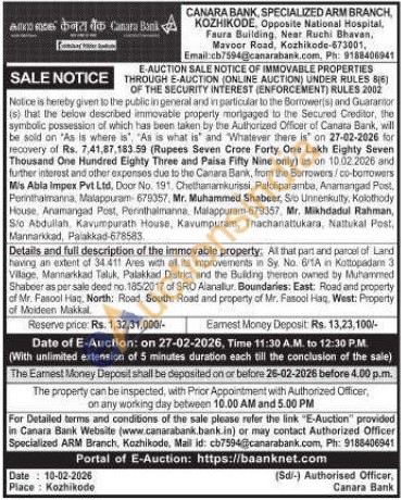 Details and full description of the immovable property: Al that part and parcel of Land having an extent of 34.411 Aves with all its improvements in Sy. No. 6/TA in Kettopadam 3 Village, Mannarkkad Taluk, Palakkad Destrict and the Buliding thereon owned by Muhammed Shabeer as per sale deed no. 185/2017 of SRO Alanallur. Boundaries: East: Road and property of Mr. Fasool Haq, North: Road, South: Road and property of Mr. Fasool Haq, West: Property of Moideen Makkal