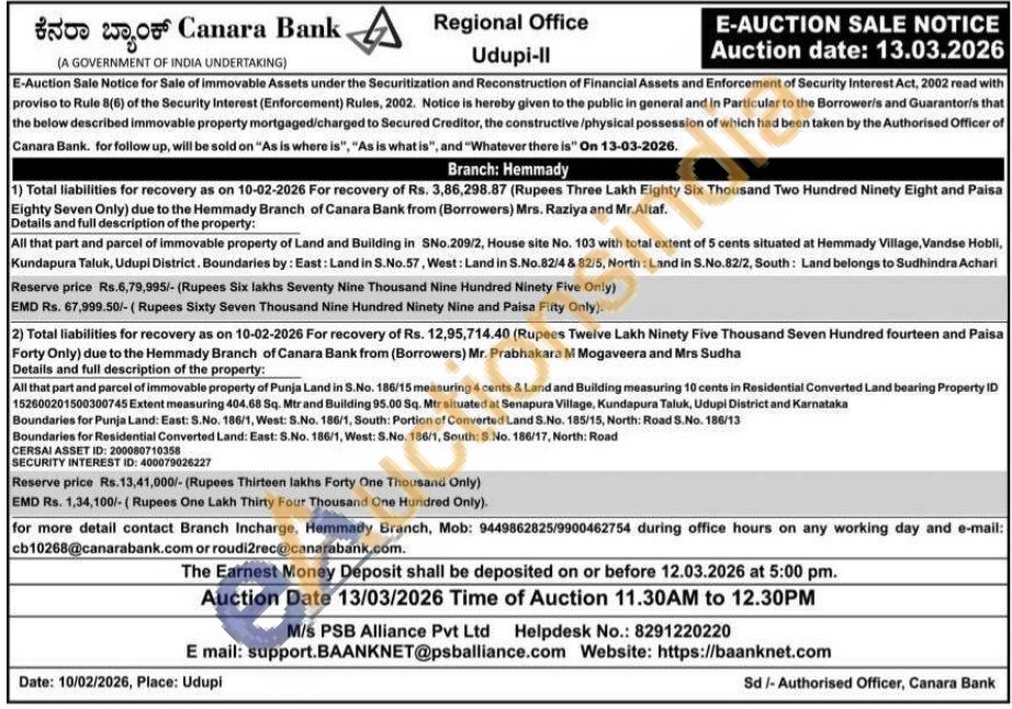 Details and full description of the immovable property: All that part and parcel of immovable property of Punja Land in S.No. 186/15 measuring 4 cents & Land and Building measuring 10 cents in Residential Converted Land bearing Property ID 152600201500300745 Extent measuring 404.68 Sq. Mtr and Building 95.00 Sq. Mtr situated at Senapura Village, Kundapura Taluk, Udupi District and Karnataka