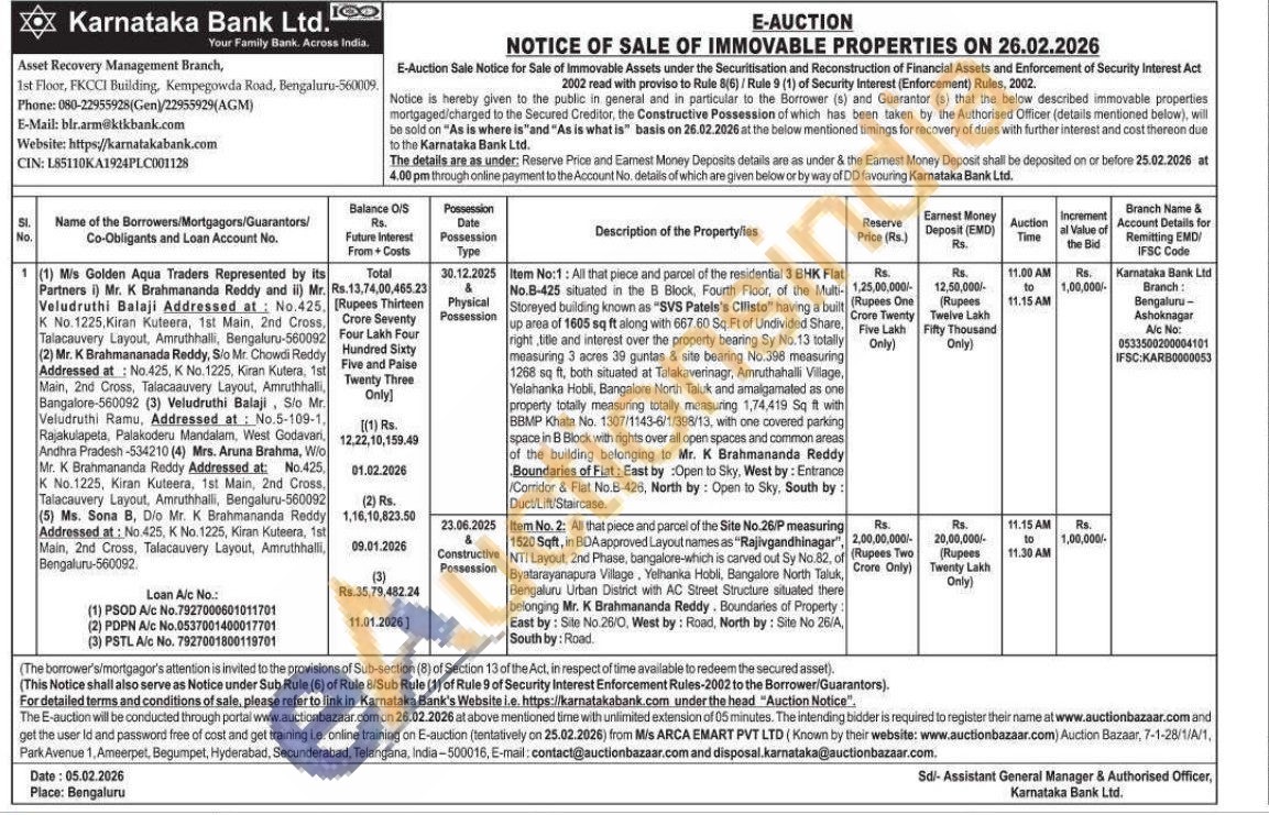 Item No:1: All that piece and parcel of the residential 3 BHK Flat No.B-425 situated in the B Block, Fourth Floor, of the Multi-up area of 1605 sq ft along with 667.60 Sq. Ft of Undivided Share. right title and interest over the property bearing Sy No. 13 totally measuring 3 acres 39 guntas & site bearing No.398 measuring 1268 sq ft, both situated at Talakaverinagr, Amruthahalli Village, Yelahanka Hobli, Bangalore North Taluk and amalgamated as one properly totally measuring totally measuring 1,74,419 Sq it with BBMP Khata No. 1307/1143-6/1/398/13, with one covered parking space in B Block with rights over all open spaces and common areas. of the building belonging to Mr. K Brahmananda Reddy Boundaries of Flat: East by: Open to Sky, West by: Entrance Comidor & Flat No.B-426, North by: Open to Sky. South by: Duct/Lift/Staircase