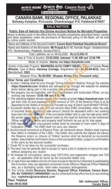 Details of Movable Property MAHINDRA ALFA COMFY DIESEL, Class of Vehicle: Three Wheeler, Type of Body: Hackney Carriage, Registration No: KL-09-AV-9232, Year of Manufacture: 2022