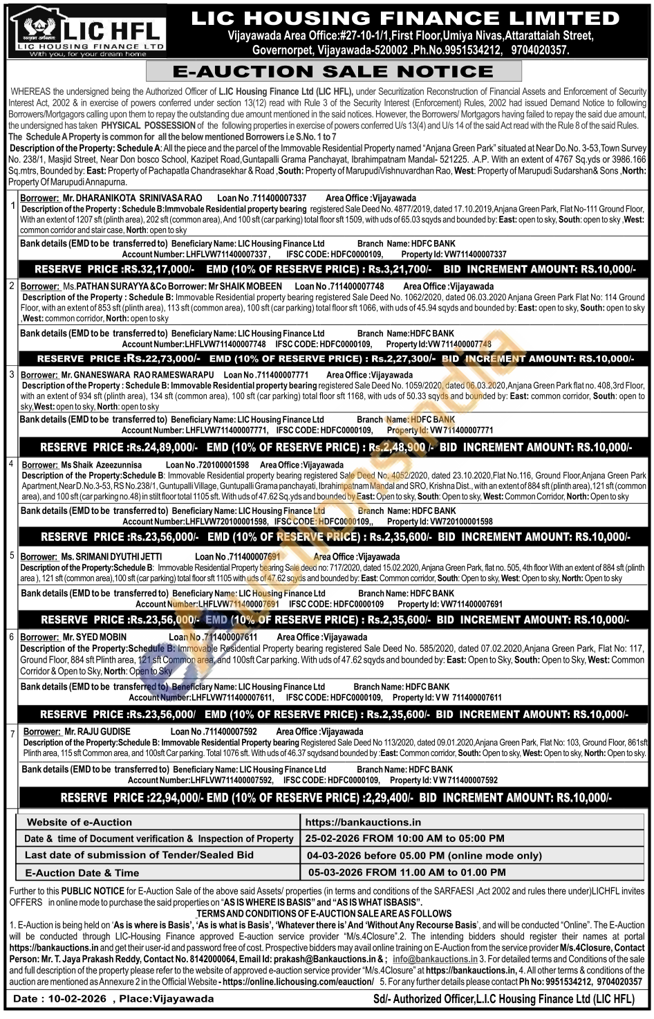 Description of the Property: Schedule B: Immovable Residential Property bearing registered Sale Deed No. 585/2020, dated 07.02.2020, Anjana Green Park, Flat No: 117, Ground Floor, 884 sft Plinth area, 121 sft Common area, and 100sft Car parking. With uds of 47.62 sqyds and bounded by: East: Open to Sky, South: Open to Sky, West: Common Corridor & Open to Sky, North: Open to Sky