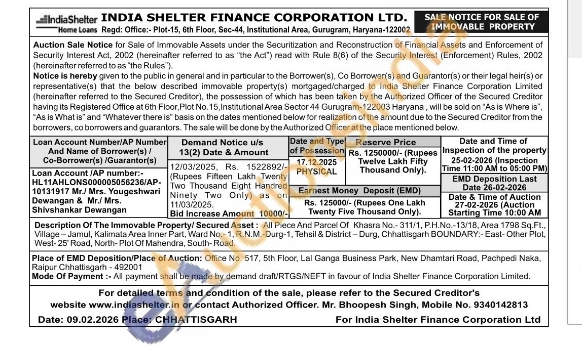 Description Of The Immovable Property/Secured Asset: All Piece And Parcel Of Khasra No.-311/1, Village-Jamul, Kalimata Area Inner Part, Ward No.- 1, R.N.M.-Durg-1, Tehsil & District-Durg, Chhattisgarh BOUNDARY:- East- Other Plot, West-25' Road, North-Plot Of Mahendra, South-Road.