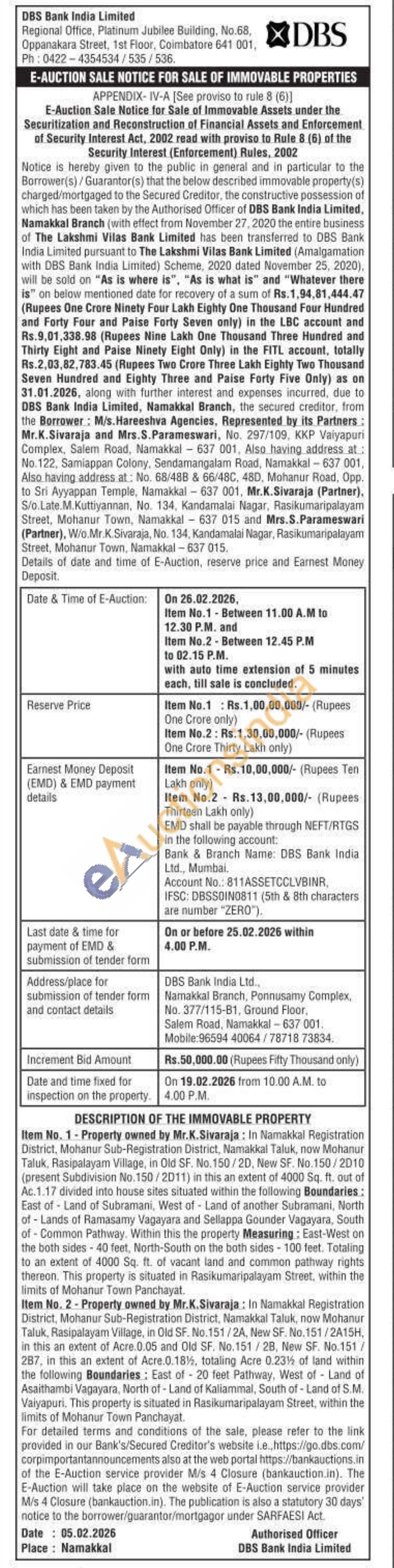 In Namakkal Registration District, Mohanur Sub-Registration District, Namakkal Taluk, now Mohanur Taluk, Rasipalayam Village, in Old SF. No.151/2A, New SF. No. 151/2A15H, in this an extent of Acre.0.05 and Old SF. No.151/2B, New SF. No.151/287, in this an extent of Acre.0.18%, totaling Acre 0.23% of land within the following Boundaries: East of 20 feet Pathway, West of Land of Asaithambi Vagayara, North of - Land of Kaliammal, South of Land of S.M. Vaiyapuri. This property is situated in Rasikumaripalayam Street, within the limits of Mohanur Town Panchayat.