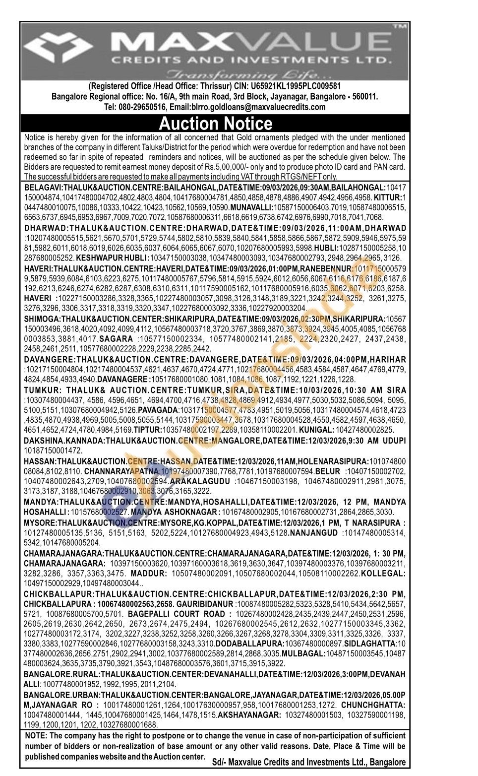 Maxvalue Credits and Investments Ltd Gold Auctions Auction in Belagavi