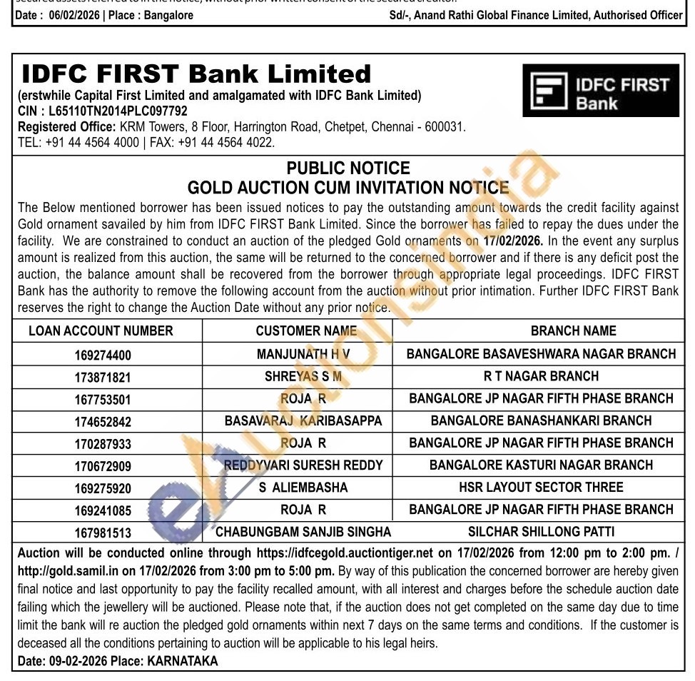 IDFC First Bank Ltd Gold Auctions Auction in Bengaluru