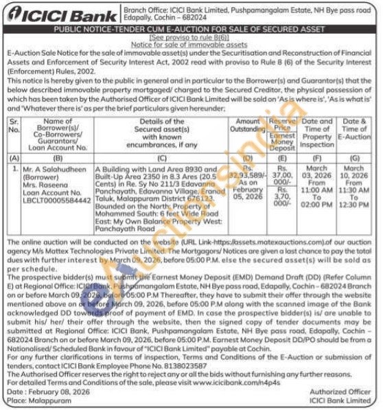 A Building with Land Area 8930 and Built-Up Area 2350 in 8.3 Ares (20.5 Cents) in Re. Sy No 211/3 Edavanna Panchayath, Edavanna Village, Eranad Taluk, Malappuram District 676123. Bounded on the North: Property of Mohammed South: 6 feet Wide Road East: My Own Balance Property West: Panchayath Road