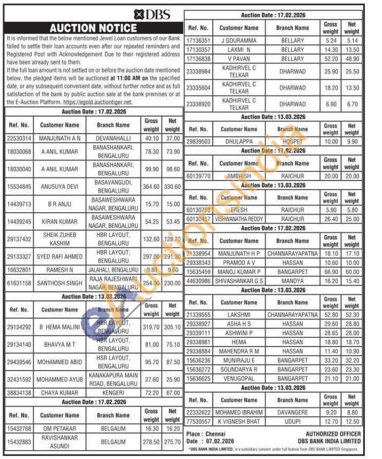 DBS Bank India Limited Gold Auctions Auction in Bengaluru