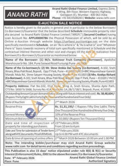 Property Address: Flat No. 102, 01st Floor, Wing A, Sneh Kinara, Shanta Apte Path, CTS No. 1650 to 1666, Survey No.41A, Hissa No. 14,28/1/18/1, Bopodi, Pune, 411020