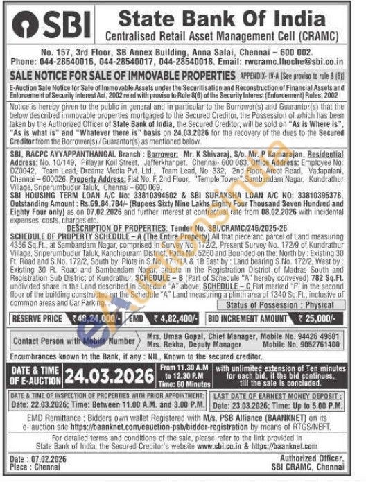 SCHEDULE OF PROPERTY SCHEDULE-A (The Entire Property) All that piece and parcel of Land measuring 4356 Sq Ft., at Sambandam Nagar, comprised in Survey No. 172/2, Present Survey No. 172/9 of Kundrathur Village, Sriperumbudur Taluk, Kanchipuram District, Patta No. 5260 and Bounded on the: North by: Existing 30 Ft. Road and S.No. 172/2, South by: Plots in S.No. 171/1A & 18 East by: Land bearing S.No. 172/2, West by Existing 30 Ft. Road and Sambandam Nagar, situate in the Registration District of Madras South and Registration Sub District of Kundrathur, SCHEDULE-B (Part of Schedule "A" hereby conveyed) 782 Sq.FL. undivided share in the Land described in Schedule "A" above, SCHEDULE-C Flat marked "F" in the second floor of the building constructed on the Schedule "A" Land measuring a plinth area of 1340 Sq.Ft., inclusive of common areas and Car Parking