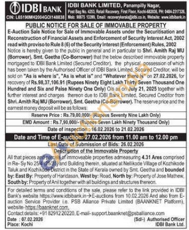 All that pieces and parcels of immoveable properties admeasuring 4.31 Ares comprised in Re-Sy No 25/4 (25/35) and Building therein, situated at Nellikode Village of Kozhikode Taluk and Kozhikode District in the State of Kerala owned by Smt. Geetha and bounded by: East By: Property of Haridasan, West by: Road, North by: Property of Jose Mathew, South by: Property of Anil together with all buildings and structures thereon