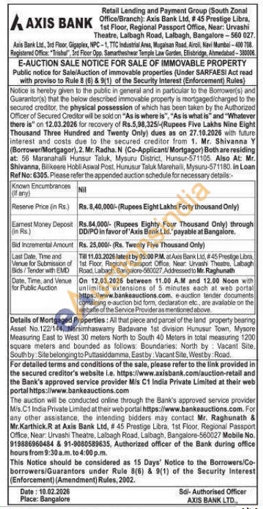 Details of Mortgaged Properties: All that piece and parcel of the land property bearing Asset No. 122/144, Narsimhaswamy Badavane 1st division Hunusur Town, Mysore Measuring East to West 30 meters North to South 40 Meters in total measuring 1200 square meters and bounded as follows. Boundaries: North by Vacant Site, South by Site belonging to Puttasiddamma, Eastby: Vacant Site, Westby Road.