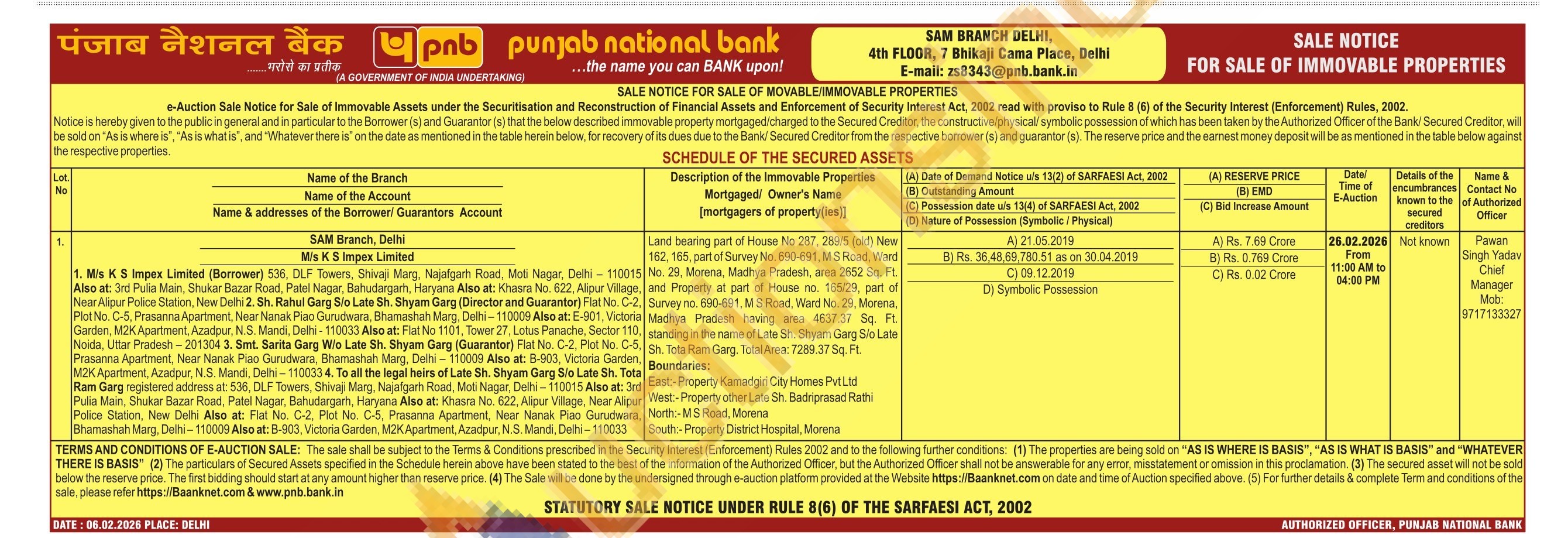 Land bearing part of House No 287, 289/5 (old) New 162, 165, part of Survey No. 690-691, MS Road, Ward No. 29, Morena, Madhya Pradesh, area 2652 Sq. Ft. and Property at part of House no. 165/29, part of Survey no. 690-691, MS Road, Ward No. 29, Morena, Madhya Pradesh having area 4637.37 Sq. Ft. standing in the name of Late Sh. Shyam Garg S/o Late Sh. Tota Ram Garg. Total Area: 7289.37 Sq. Ft.