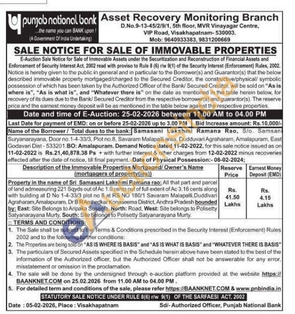 All that part and parcel of land admeasuring 221 Sqyds out of Ac 1.0 cents out of full extent of Ac 3.16 cents along with building at D No 1-4-33/3 plot no 8 at RS NO 180/1 Savaram Malapalli, Duddivan Agraharam Amalapuram, Dr BR Ambedkar Konaseema District, Andhra Pradesh bounded by: East: Site Belongs to Aripaka Suseela, North: Road, West: Site belongs to Polisetty Satyanarayana Murty, South: Site belongs to Polisetty Satyanarayana Murty